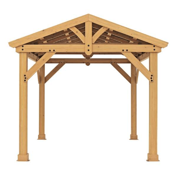 Plus, it includes all necessary hardware and simple-to-follow illustrated instructions. The Premium gable roof design and 6” x 6” posts with plinths create a sleek, straight-line look that will complement any backyard décor. The Coffee Brown aluminum roof provides protection from the elements, while the Natural Cedar stain finish adds a touch of luxury. Don’t miss out on this must-have backyard addition – order your Yardistry 10 x 10 Meridian Pavilion today