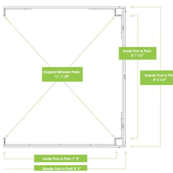 • Base Dimensions (outside post to outside post): 9’ 6 ½” x 8’ 8” W
