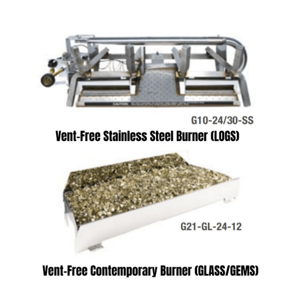 American Fyre Design fireplaces can be powered by either natural gas or liquid propane. Multiple burner options are available, including Manual Ignition, On/Off Remote System with Standing Pilot, Variable Flame with Standing Pilot, or Electronic Ignition. To further customize your fireplace, the location of its gas shut off valve and gas line can be modified to your specifications.