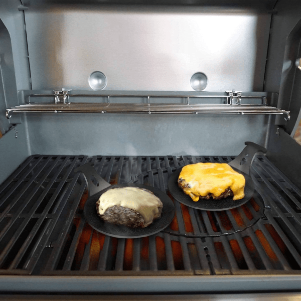 Note: When the burger pucks arrive, they will be silver (unseasoned). They will develop the dark color shown in the images once they've been seasoned.