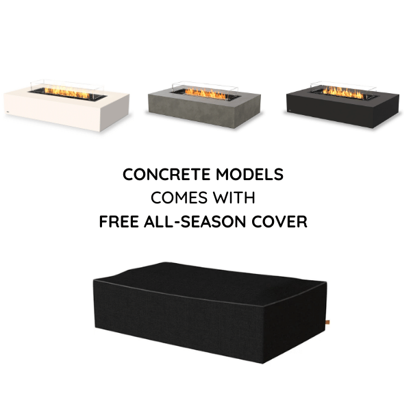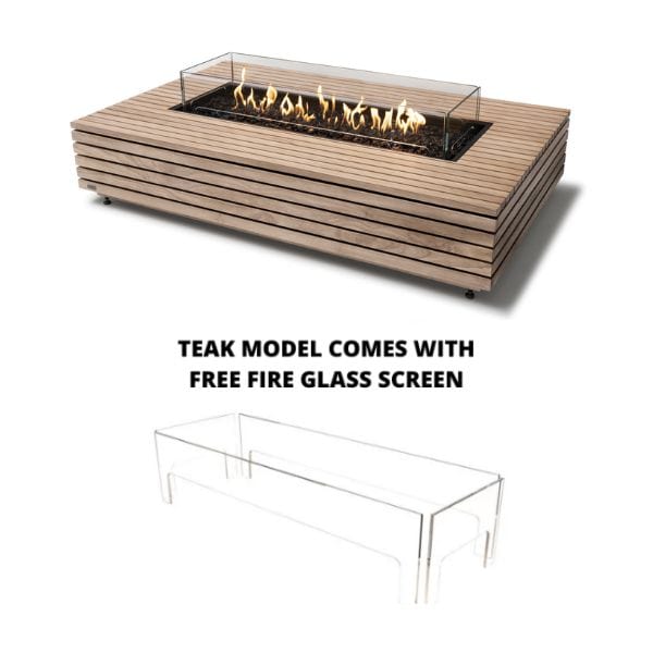 - Materials: Fluid Concrete or Teak, Grade 304 Stainless Steel Burner, Toughened Glass Fire Screen