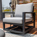 The Laguna chair features a powder-coated aluminum frame with multi-step protective coating, HDPE wicker armrests that resist fading and cracking, and Sunbrella® Canvas Granite fabric with fade-resistant properties. The quick-dry cushions also prevent mildew and moisture damage.