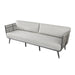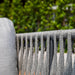 The sofa includes robust warranties: 10 years for the aluminum frame (residential), 3 years for the finish and rope, 2 years for cushions, and a 5-year fade warranty for the Sunbrella® fabric.