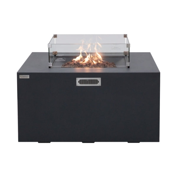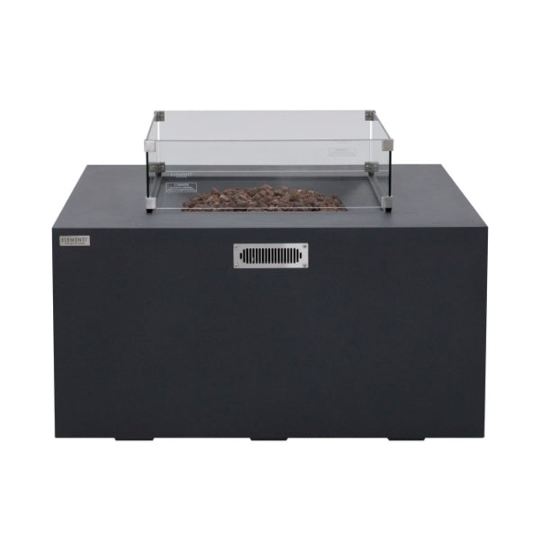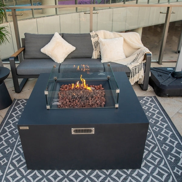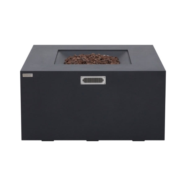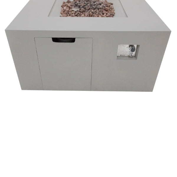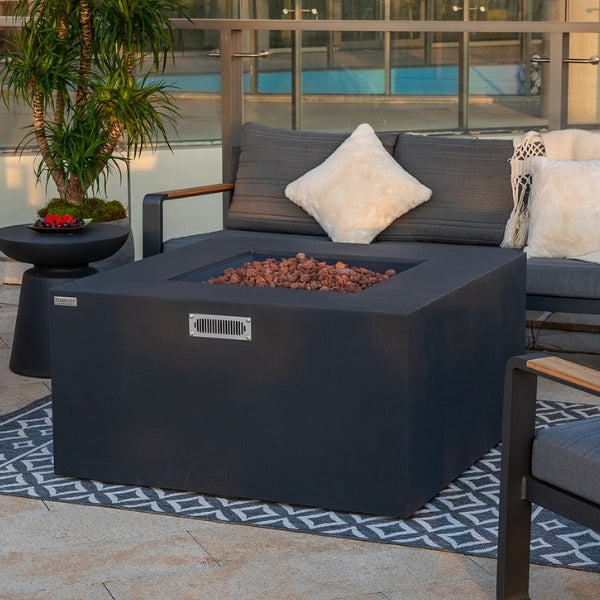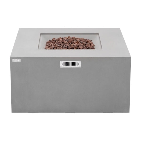 Enhance your outdoor living space with the Elementi Rocky Fire Table OFG310, a stunning fusion of contemporary design and powerful performance. This 43.3" square propane fire pit table is handcrafted from glass-fiber reinforced concrete (GFRC), featuring a sleek honed texture that adds a touch of elegance to any patio, deck, or garden.