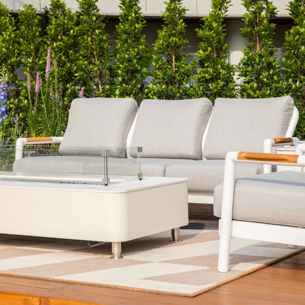 Accented with solid teak armrests and plush Sunbrella® cushions, the Santorini sofa provides all-season usability and modern aesthetic appeal, making it a timeless investment in outdoor luxury.