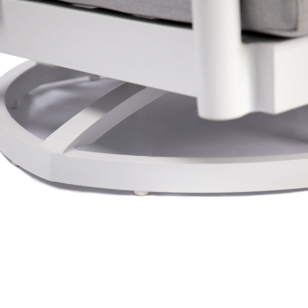 Outfitted with plush quick-drying cushions in Sunbrella® Natte Grey Chine fabric, this chair offers a 360° swivel base for flexible outdoor lounging—all in a design that beautifully balances elegance and resilience.