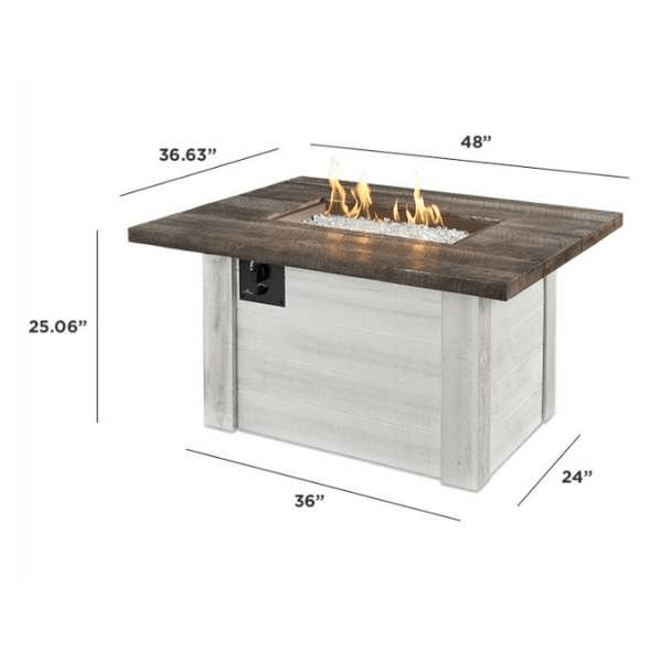 The Outdoor GreatRoom Alcott Rectangular Gas Fire Pit Table is the perfect addition to your outdoor space! With its beautiful Antique Timber Supercast™ concrete top and White Washed shiplap base, it adds a touch of rustic charm that is perfect for any modern farmhouse aesthetic. The Dora Brown Crystal Fire® Plus burner provides a warm, relaxing glow, making it the perfect spot to gather with friends and family. Thanks to its durable construction, this fire pit table will last for years to come!