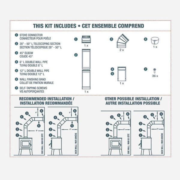 Reduce clearances up to 5"! This kit contains 1x appliance connector, 1x double wall pipe 6" length, 1x double wall pipe 12" length, 1x telescoping section 28" to 50", 2x 45° elbows, and 36x self-tapping screws. Save yourself time and reduce the cost of purchasing these components individually.